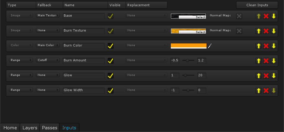 The buttons on the right are for re-ordering and deleting inputs. The order in-which the Inputs appear is how they'll appear in the material panel. Deleting Inputs remove them from anything that uses them. Settings that use a deleted input retain the inputs old value, but are unlinked.